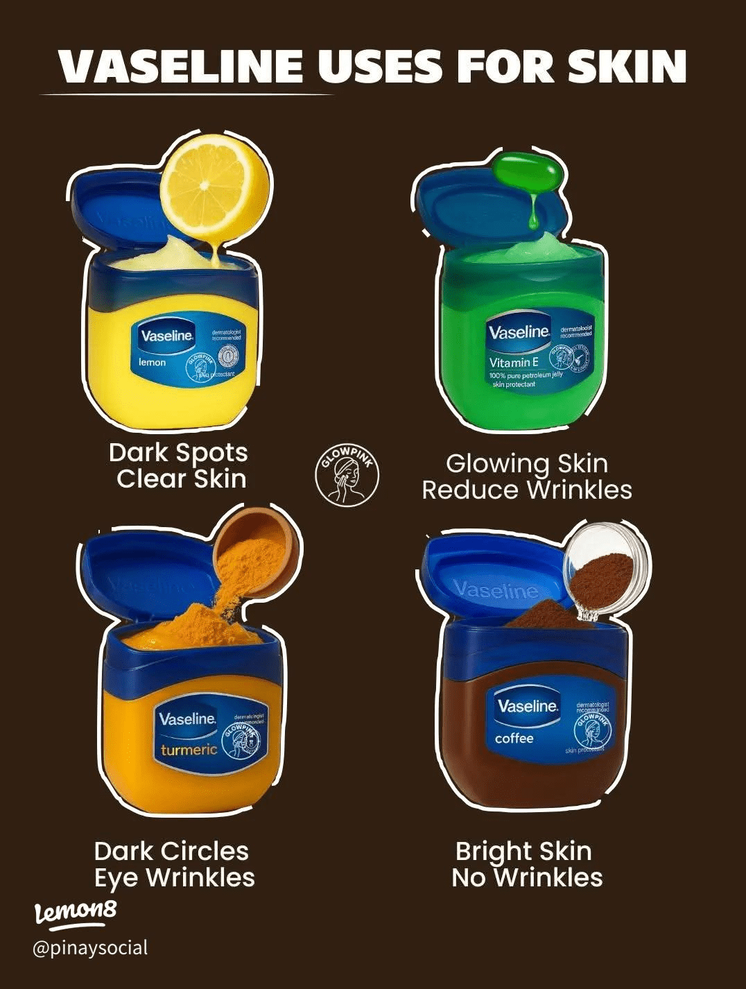 - Vaseline with Turmeric. Turmeric is a golden spice used for centuries, and research indicates it may support a more even skin tone. Mixing just a pinch with Vaseline creates a paste that some people apply to dull areas. Be careful, though, because turmeric can stain fabrics.