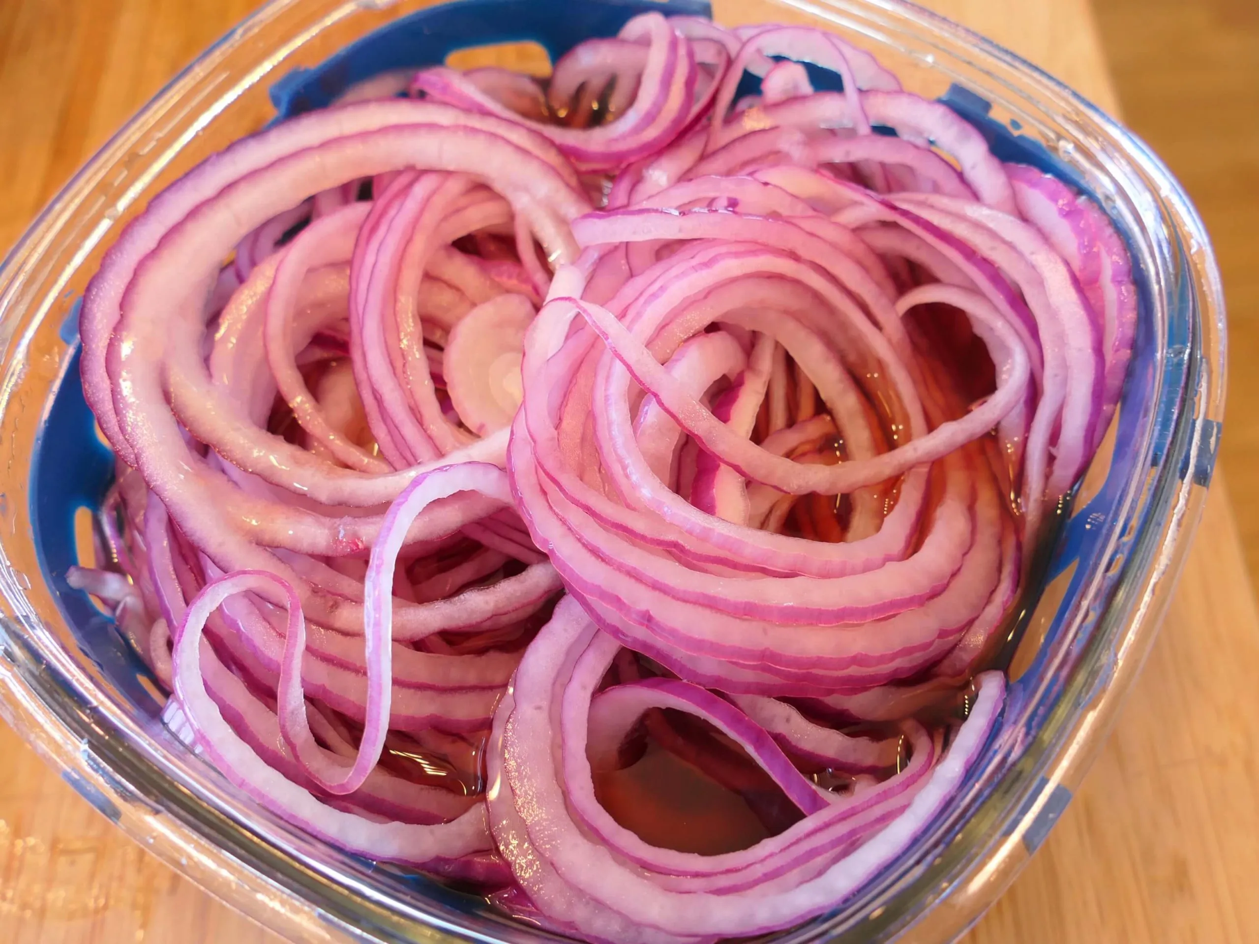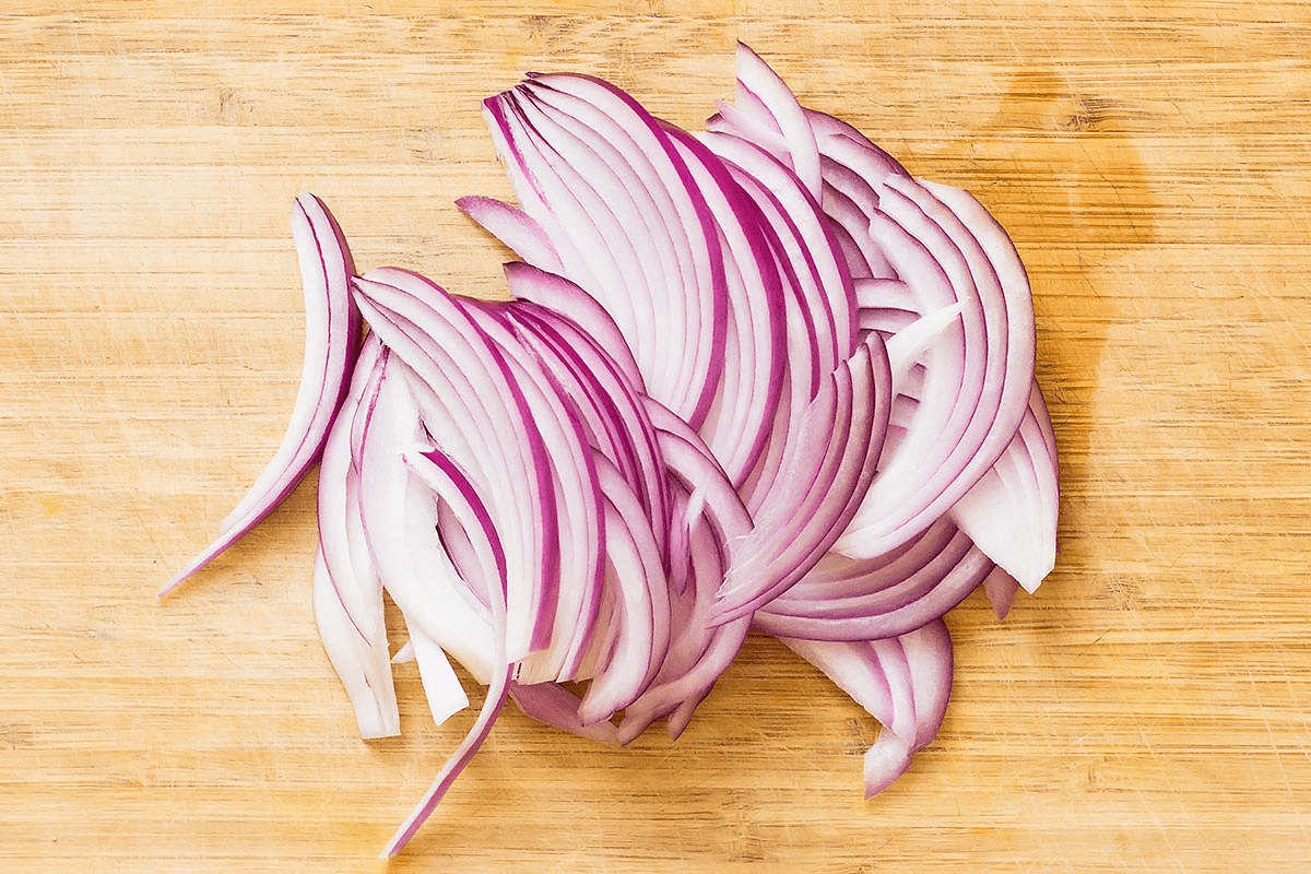 1. Thinly slice the red onion (use a mandoline if available for even cuts). Place in a bowl.