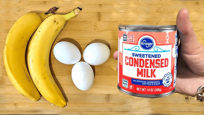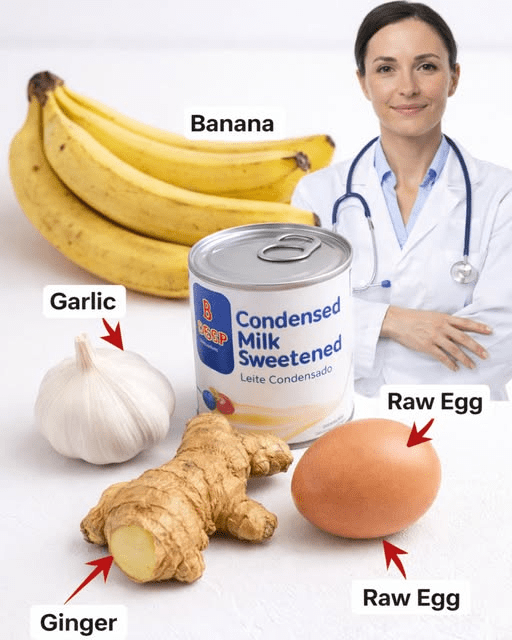 Blend 1–2 ripe bananas, a small piece of fresh ginger (about 1 inch), 1 clove garlic (optional for milder taste), 1 raw egg (if using), and 2–3 tablespoons condensed milk.