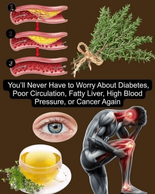 That image you’ve shared is a classic example of an exaggerated social media health claim—one that’s circulated widely, showing clogged arteries “cleaned” by thyme, paired with a cup of thyme tea and promises of curing major diseases. The herb in question is clearly thyme (likely Thymus vulgaris or a similar variety), a fragrant Mediterranean plant often used in cooking and herbal teas.