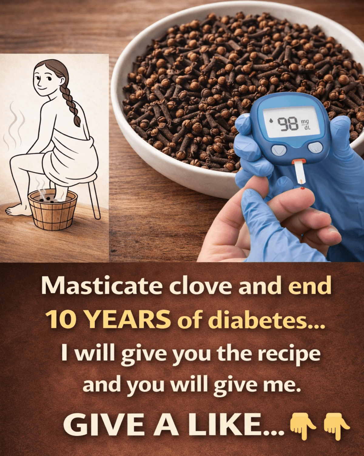 You see a post promising that chewing just two cloves a day – or soaking your feet in clove water – can wipe away 10 years of diabetes. The image shows a happy woman with her feet in a steaming basin of cloves, next to a blood glucose meter reading a perfect 98 mg/dL. It feels hopeful, almost too good to be true.
