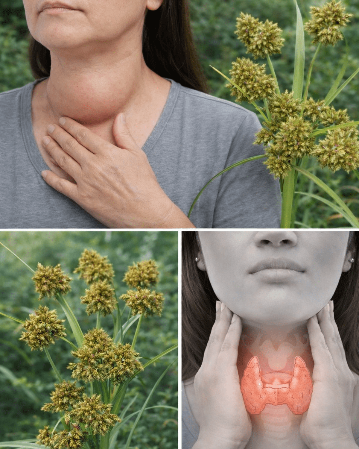 Picture touching your neck and feeling that familiar swelling or lump, the subtle tightness that makes swallowing or turning your head uncomfortable. For many, goiter or thyroid imbalances bring quiet frustration—energy dips, mood swings, or visible changes that affect confidence. The image shows a woman gently pressing her throat, alongside clusters of small, brownish seed heads on slender green stems rising from grass-like leaves. This plant often dismissed as a stubborn weed pops up in gardens, fields, and roadsides worldwide. Social media posts claim it’s a “hidden wonder” that cured a 70-year-old’s goiter permanently. Intriguing, right? But what does evidence actually reveal about its role in thyroid support?