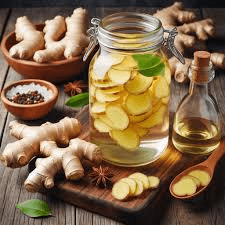 Layer ingredients in the jar, cover fully, seal loosely (or use airlock if available). Let ferment at room temperature 3-14 days, “burping” daily to release gases. Taste for tanginess—refrigerate once ready. Sip 1-2 tablespoons daily, diluted in water if strong.